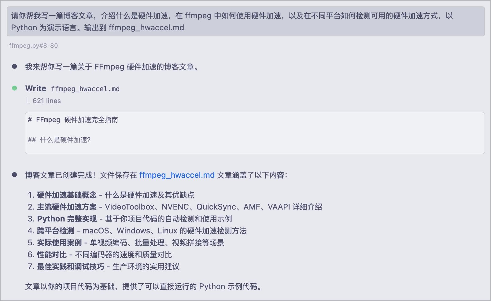 这种创作方式还挺有意思,因为很多时候在写完某个功能之后,会有很强的欲望想分享自己实现的方案,但是重新总结形成文字又是很消耗精力的过程(所以这篇才会被我拖了接近一年)。提供思路(文章大纲和代码),让 AI 代劳文字组织的过程,至少能形成一篇像模像样的文章。这跟「由 AI 生成」最大的区别就是,如果你让 AI 「写一篇 ffmpeg 硬件加速的文章」,这是没有你的功劳的。