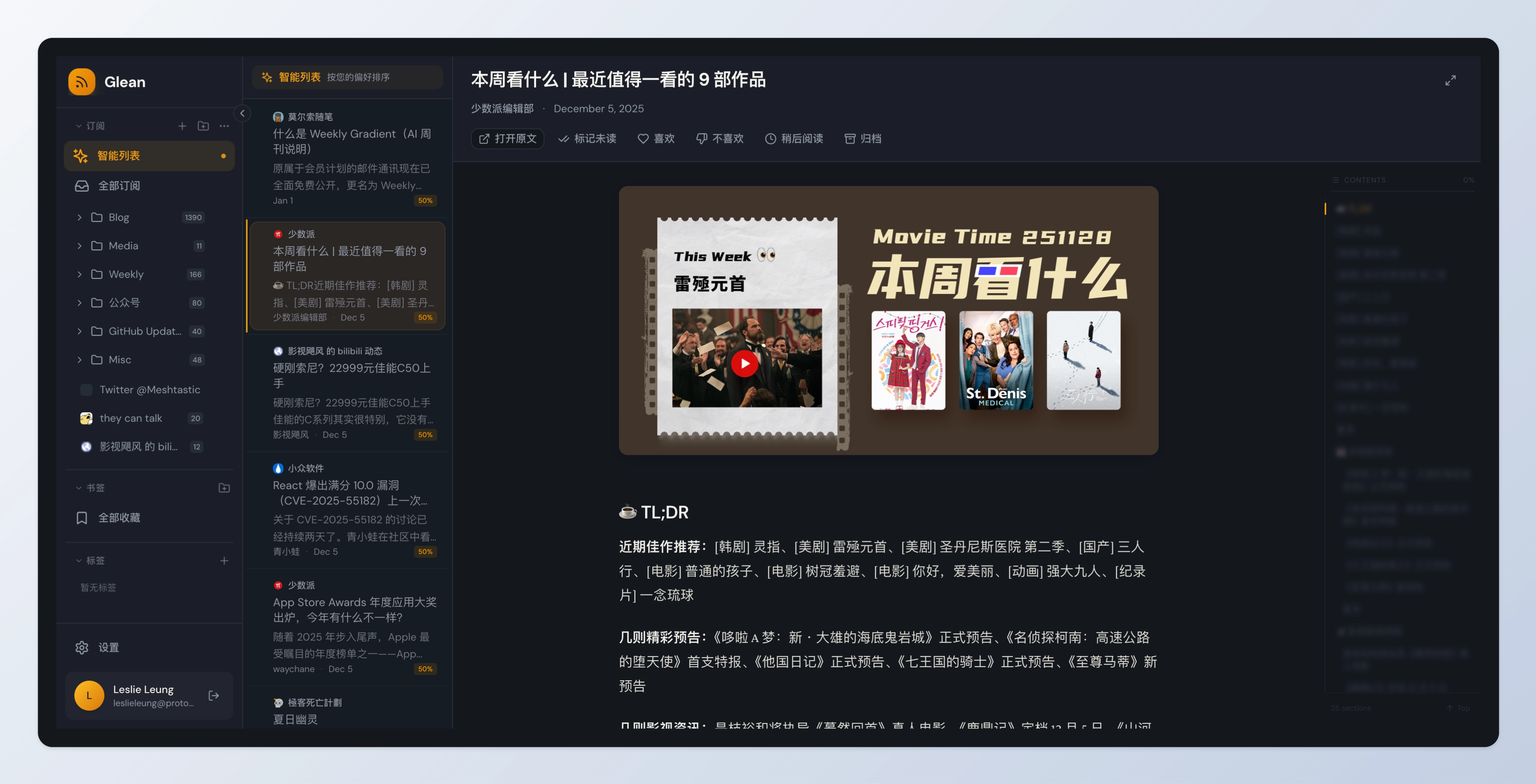 这周主要很多时间精力花在一个新坑上,起因是最近 Folo 团队裁员,裁掉了最核心的两位贡献者,而且发布了所谓「正式版」,加上怎么都关不掉的 AI 功能,实在让我觉得非常难受。RSS 阅读器这块我从一开始的 Reeder(Classic)到 NetNewsWire 再折腾到 Follow(Folo),来回折腾其实都只是不一样的界面,功能上没有什么特别亮眼的,也没有能针对我的信息获取工作流做优化的地方。于是我决定写一个自己的 RSS 阅读器 Glean,中文名叫拾灵,具体的后面细说。