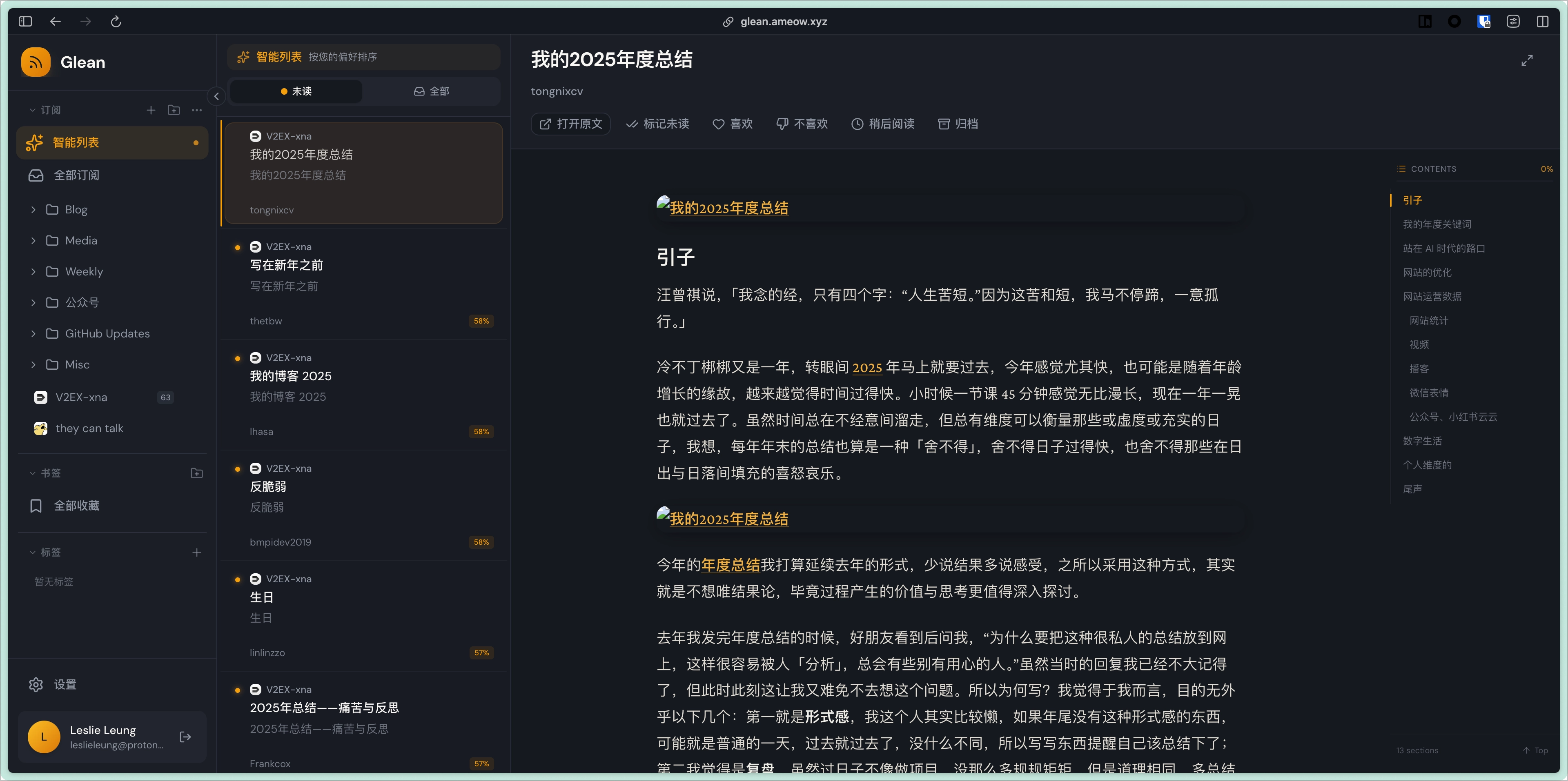 这周主要做了一个获取全文的功能,以及一些细节的优化。有了获取全文的功能之后,就可以实现对一些聚合类型的订阅(例如 VXNA)结合之前做的偏好系统进行打分,阅读体验也会更好。